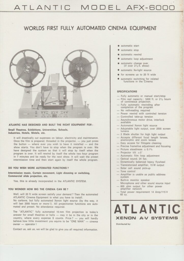 Information sheet on the Atlantic AFX-6000 projector, for screens up to 20 ft wide.