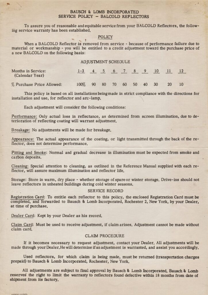 A service policy from Bausch & Lomb for their Balcold reflectors.