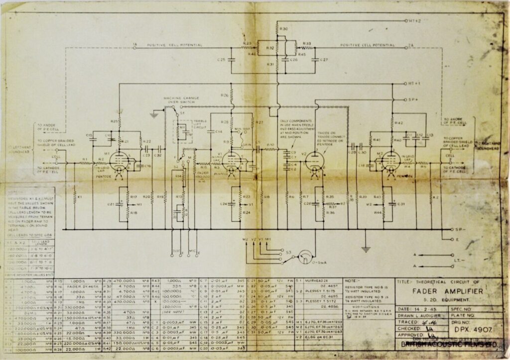 A circuit diagram for the S.20. Power Amplifier and Fader Amplifier. Originally marked British Acoustic Films but later Rank Precision Industries.
