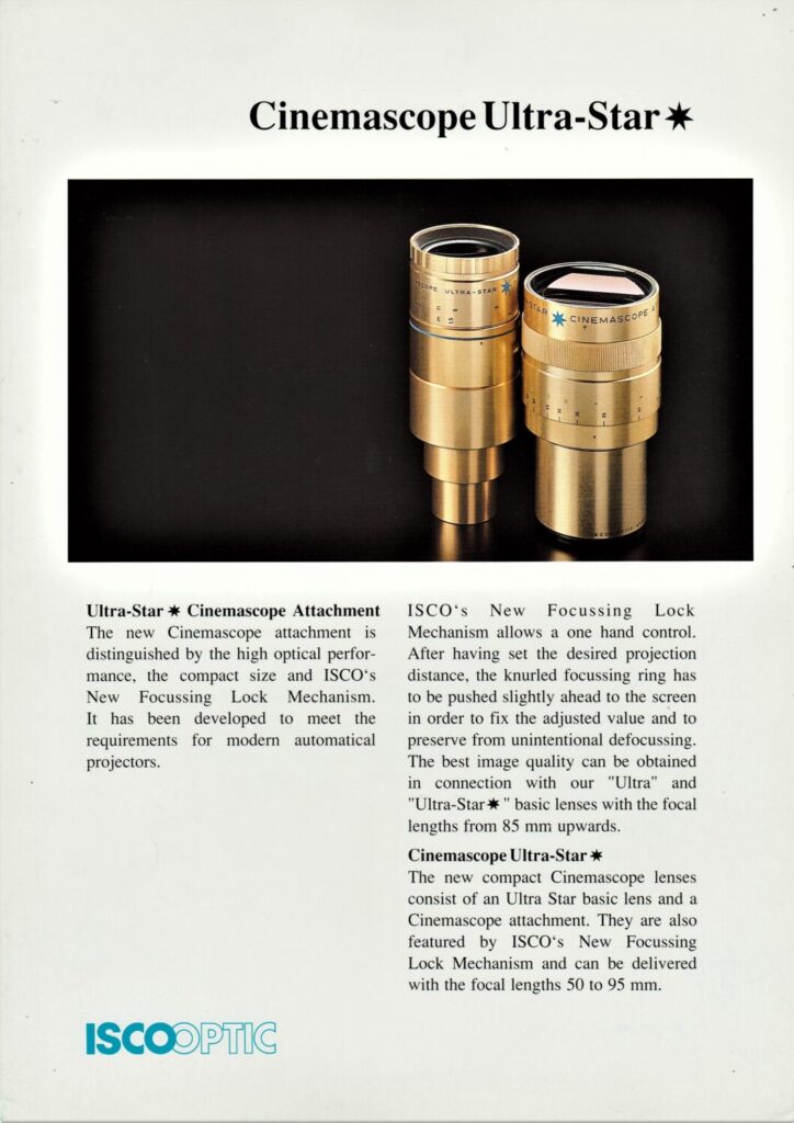 Information sheet on ISCO's Ultra-Star anamorphic CinemaScope attachment.