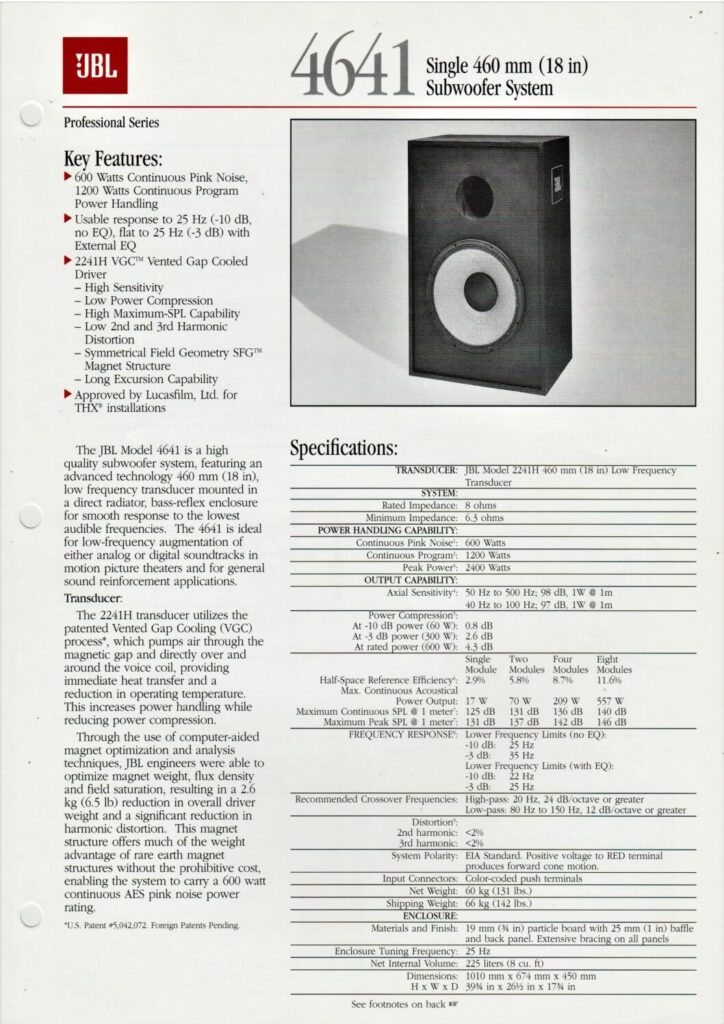 Specification sheet for the JBL 4641 18" subwoofer speaker.