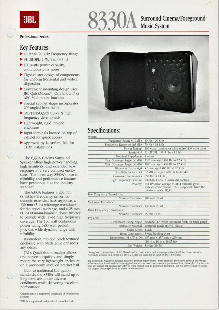 Specification sheet for the JBL 8330A surround speaker and music system.