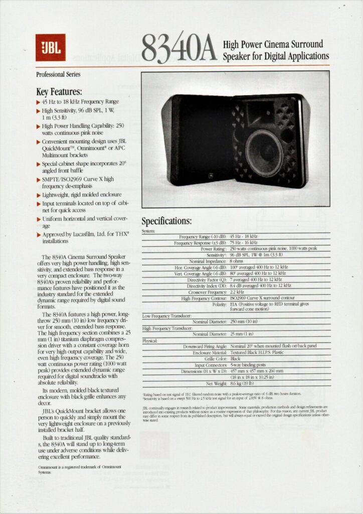 Specification sheet for the JBL 8340A surround speaker.