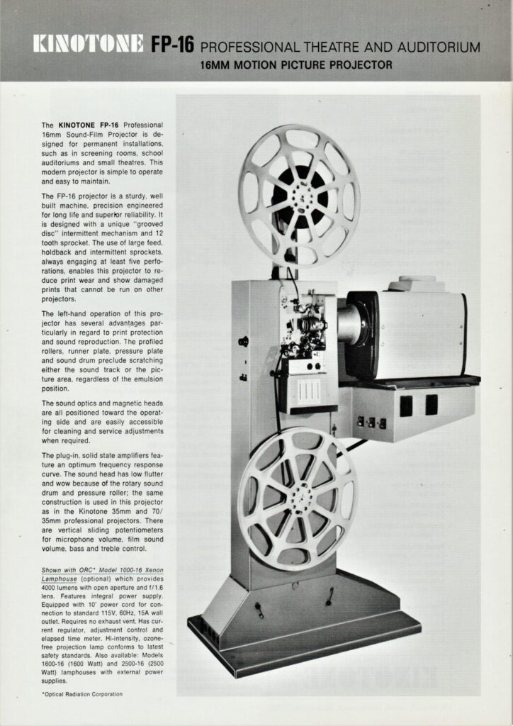 An information sheet about the Kinotone branded FP-16 film projector.