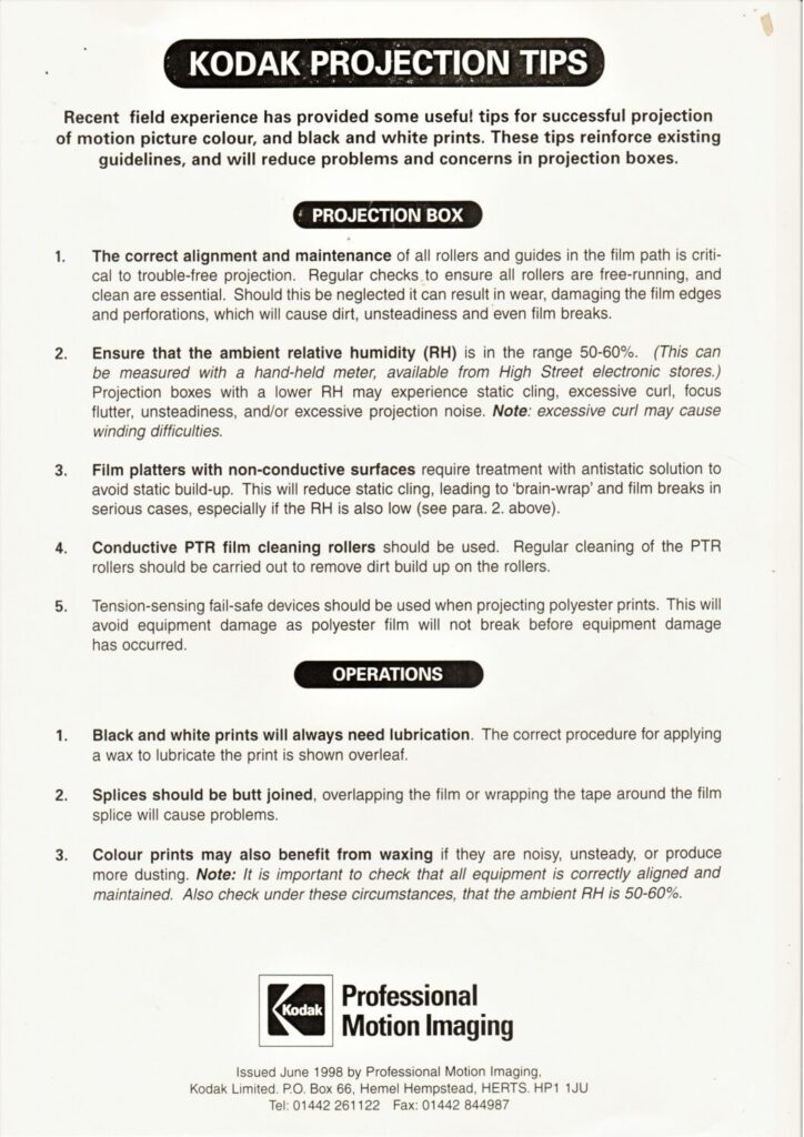Kodak projection tips, including advice on edge waxing, relative humidity and film cleaning.