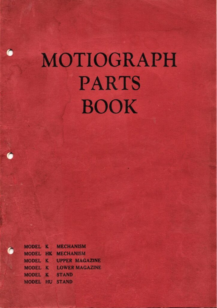 A parts book for the Motiograph Model K mechanism, magazines, and stand; HK mechanism; and HU stand.