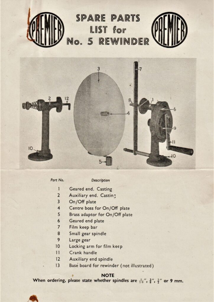 A spare parts diagram and list for the Premier No. 5 film rewinder.