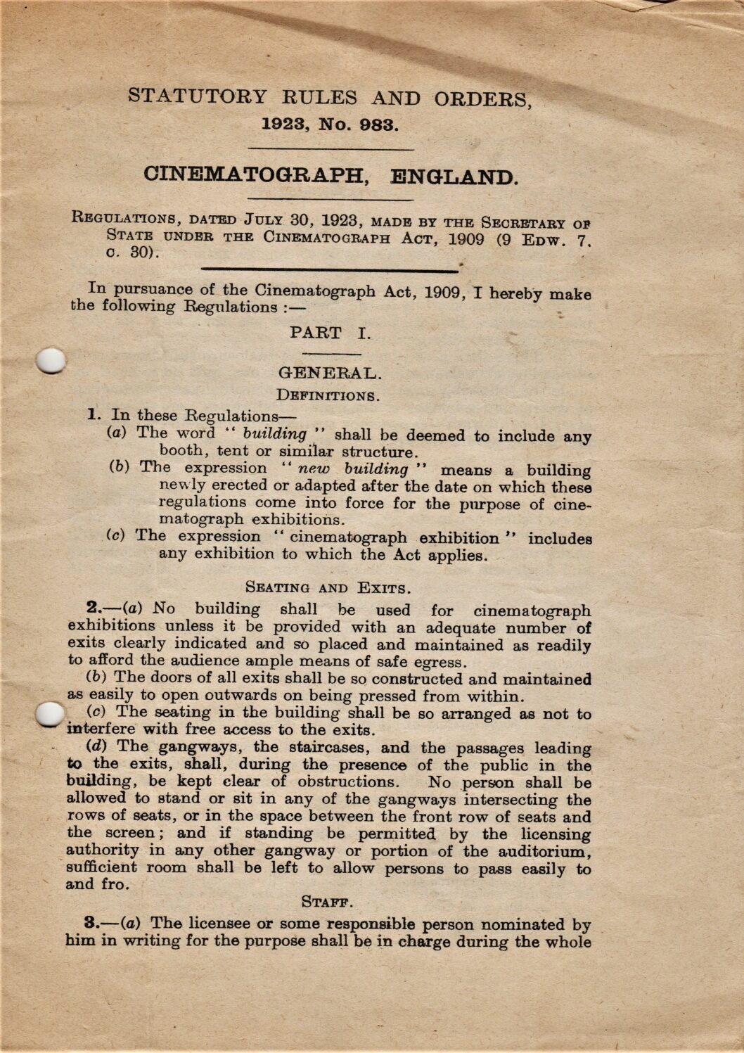 A 1923 regulation covering the construction, staffic and operation of cinemas in the UK.