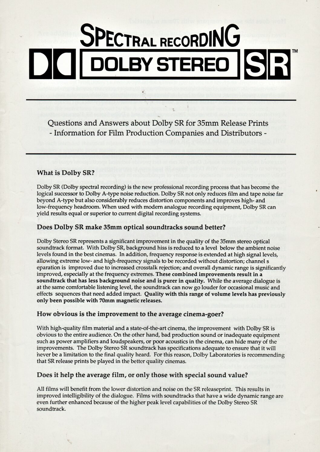 A fact sheet published by Dolby about Dolby Stereo Spectral Recording (SR).