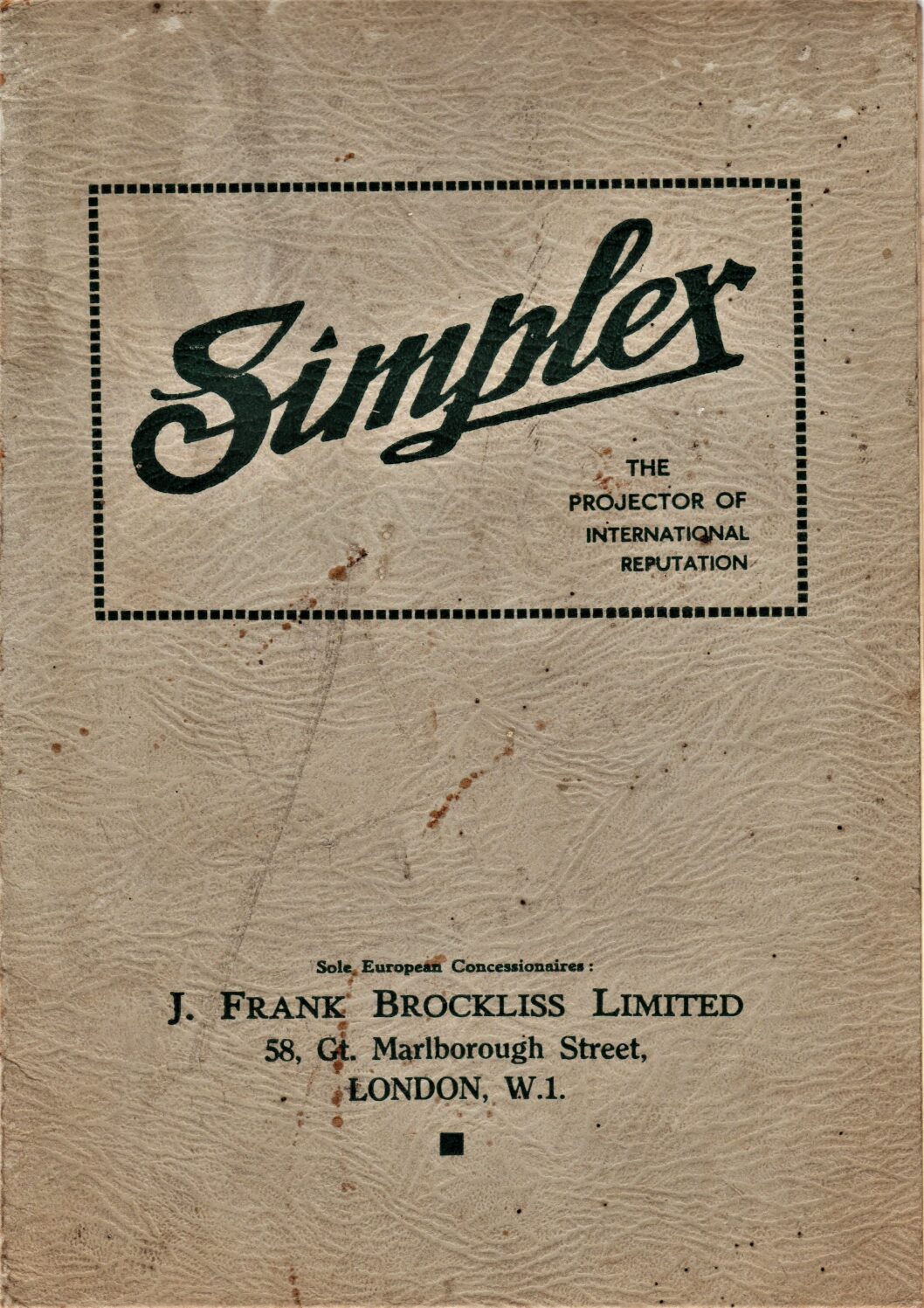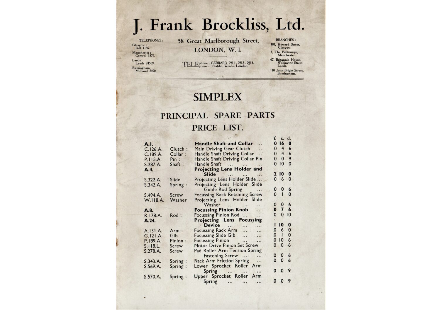 Spare parts and price list for Simplex film projectors from J. Frank Brockliss, Ltd.