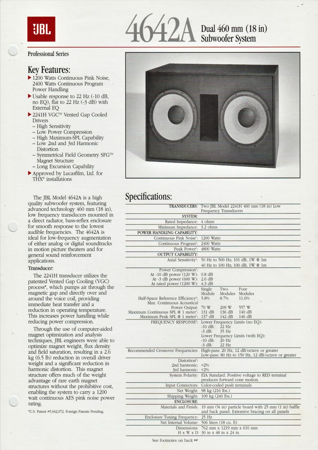 Datasheet for the JBL 4642A subwoofer.