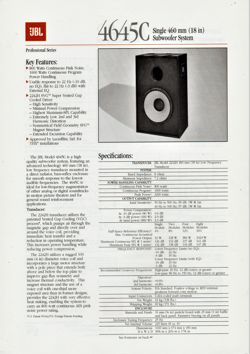 Datasheet for the JBL 4645C subwoofer.