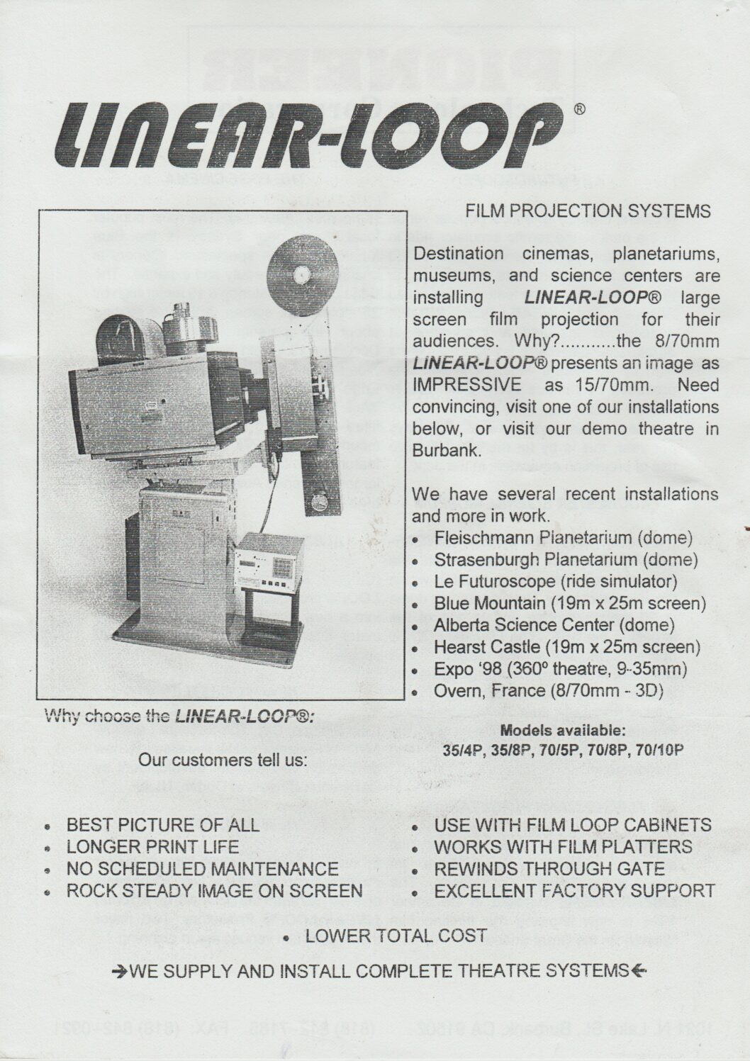 Information sheet about the Linear-Loop 8/70mm system by Pioneer Technology Corporation.