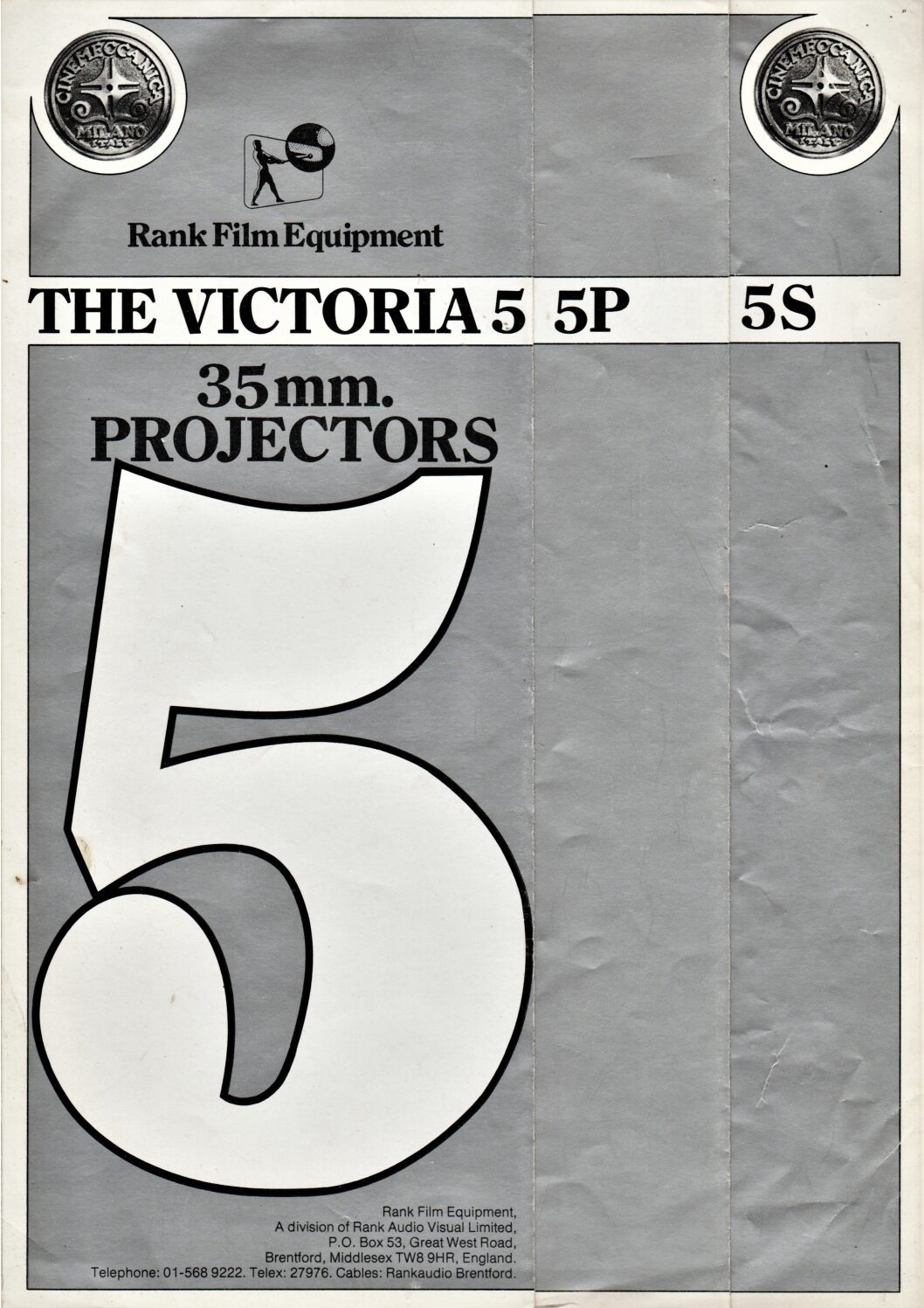 A leaflet covering the projectors in the Cinemeccanica Victoria 5 range, including the 5P, 5S, 5B, 5U, 4DB and 5MI.