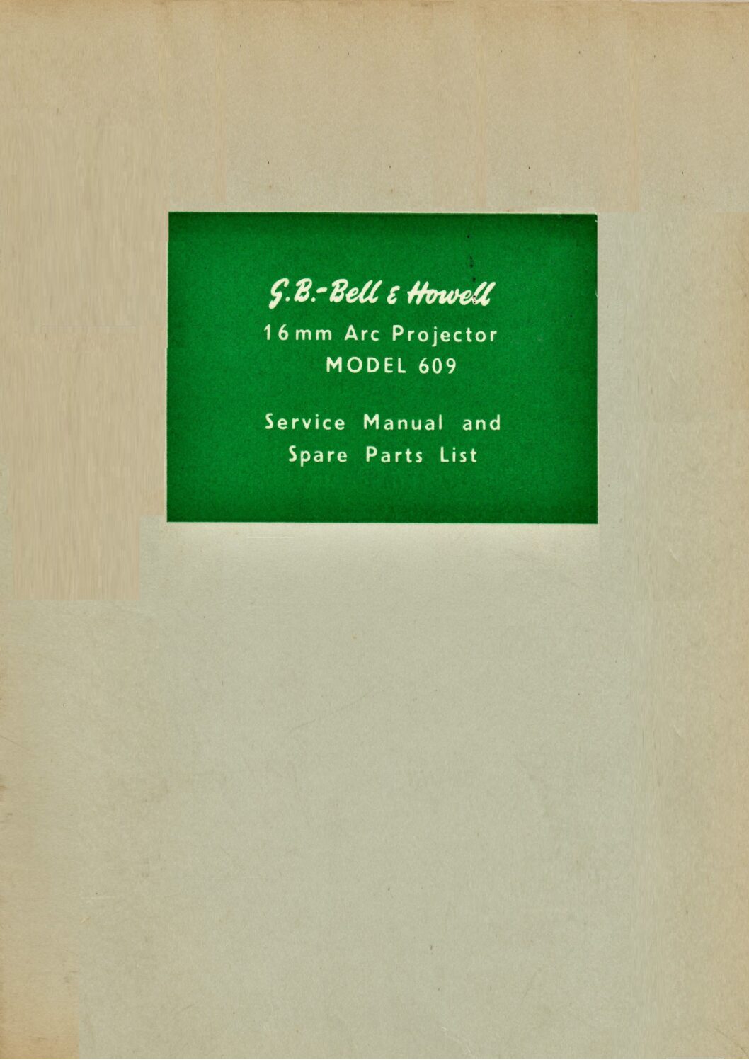 The service manual and spare parts list for the G.B.-Bell & Howell 16mm Arc Projector Model 609.