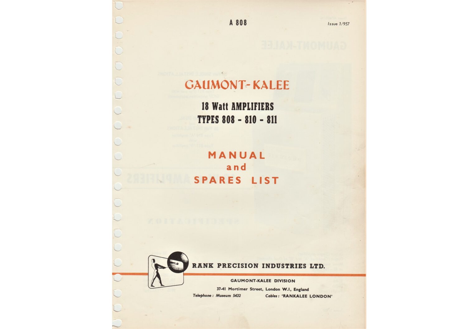 Manual and spare parts list for Gaumont-Kalee amplifiers types 808, 810 and 811.