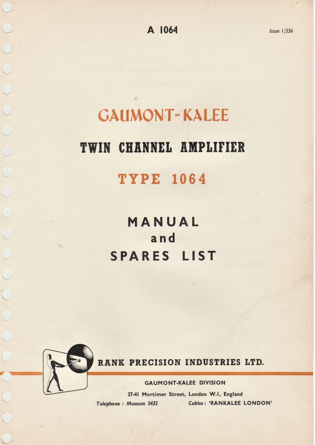 A manual and spare parts list for the Gaumont-Kalee 1064 amplifier.