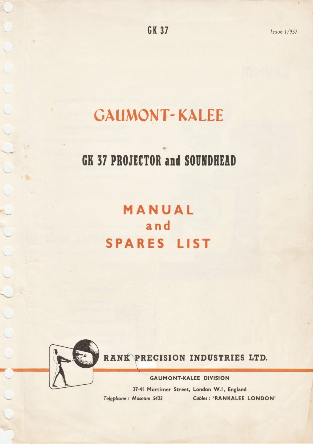 The operating manual and spare parts list for the Gaumont-Kalee 37 projector and soundhead.