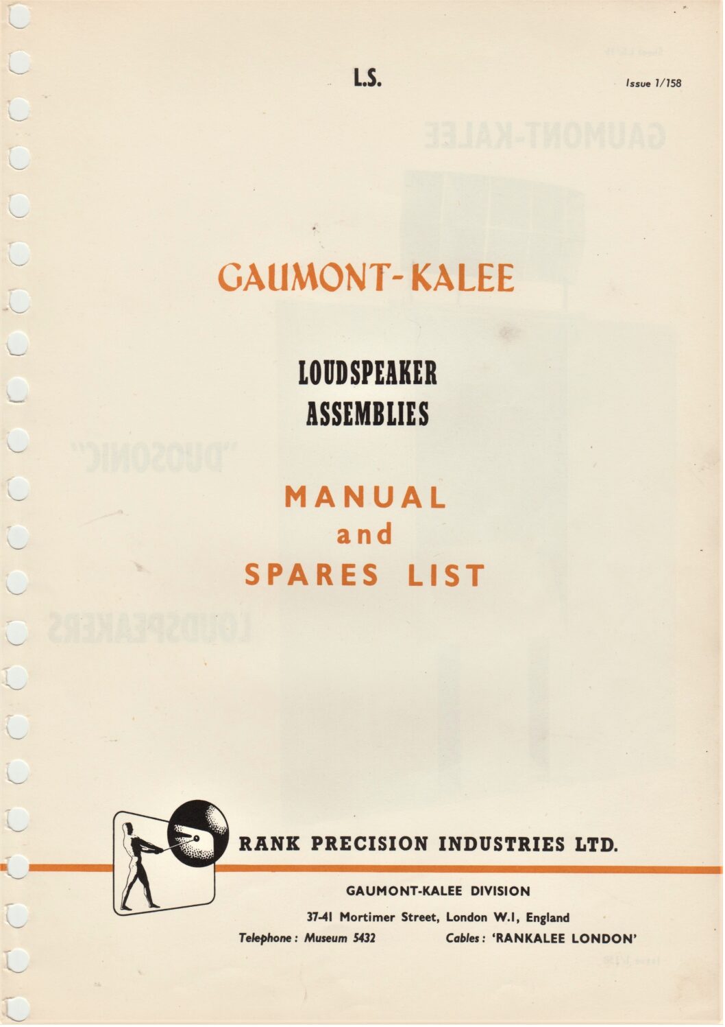 A manual for the Duosonic series of loudspeakers by Gaumont-Kalee, including spares list.