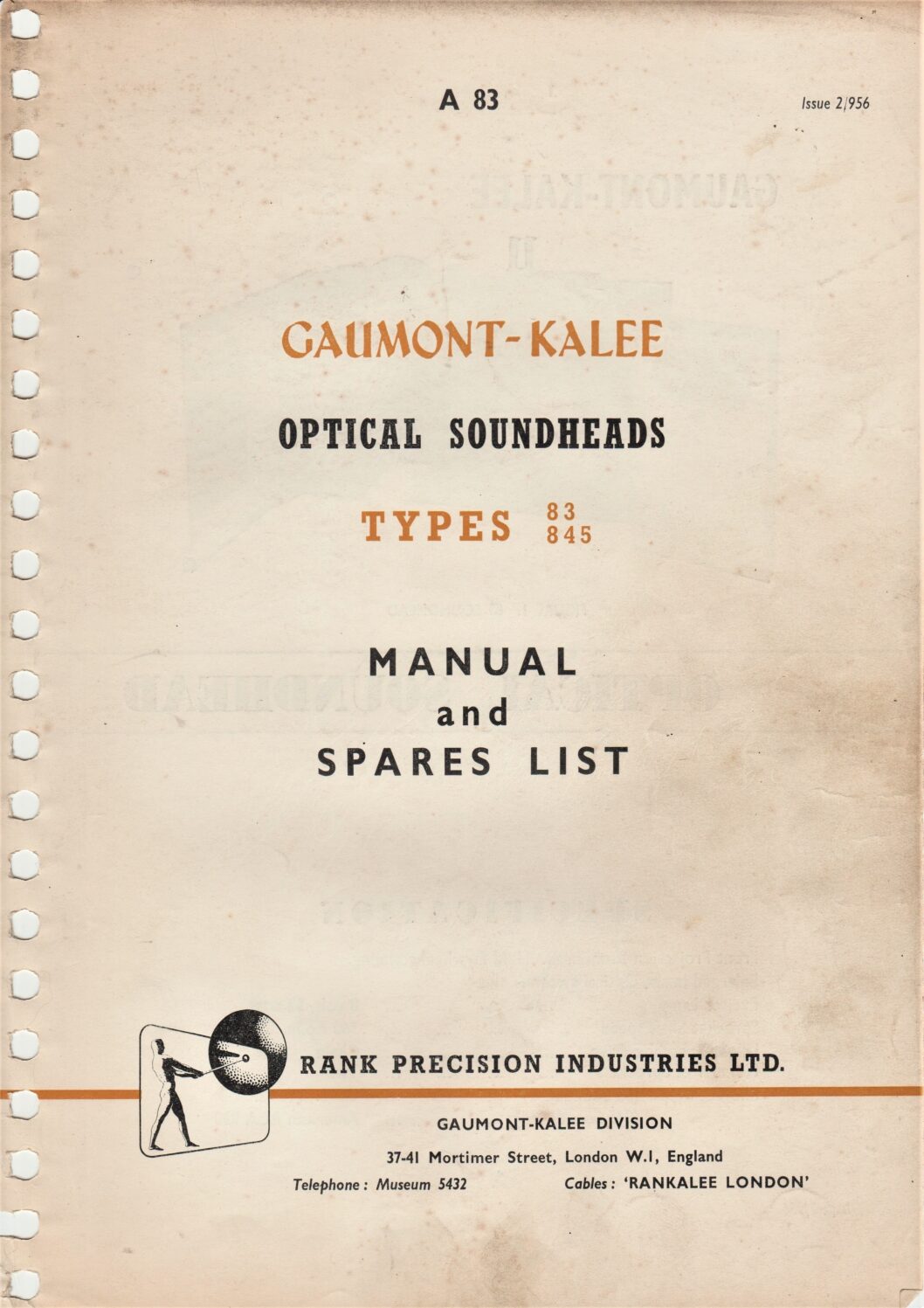 Operation manual and spares list for the Gaumont-Kalee 83 and 845 optical soundheads.