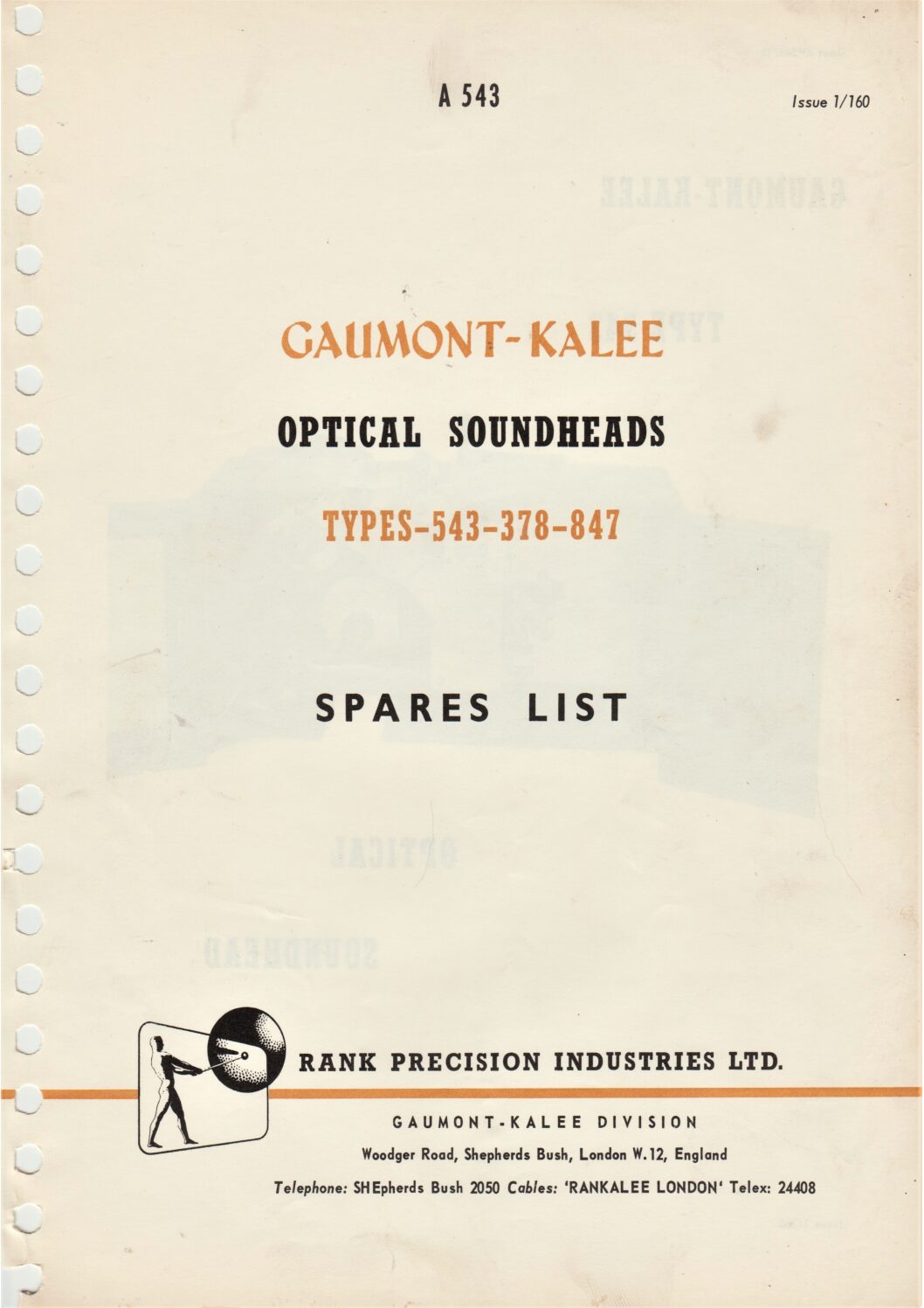 A spare parts list for the 543-3780847 Gaumont-Kalee optical soundheads.