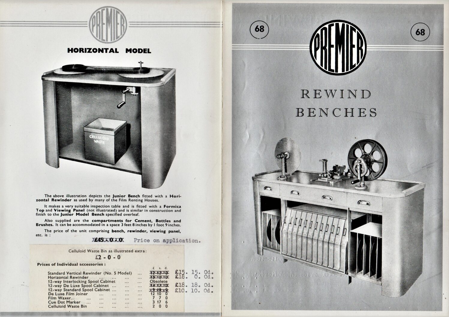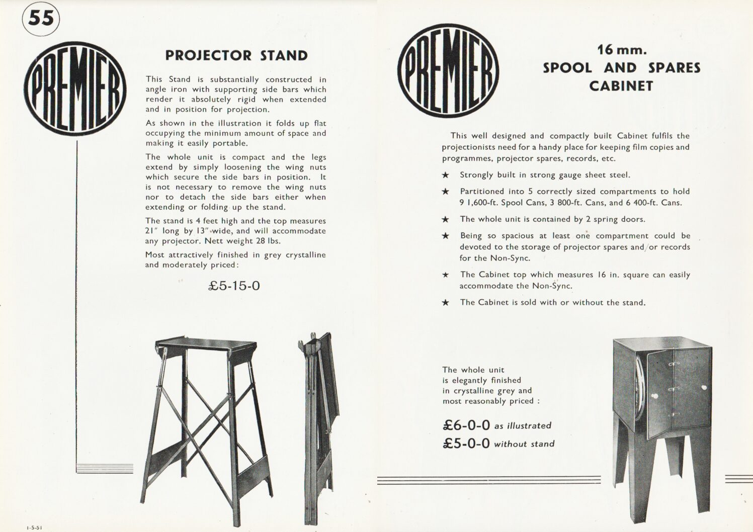 A Premier brochure for a projector stand, and a 16mm spool cabinet.