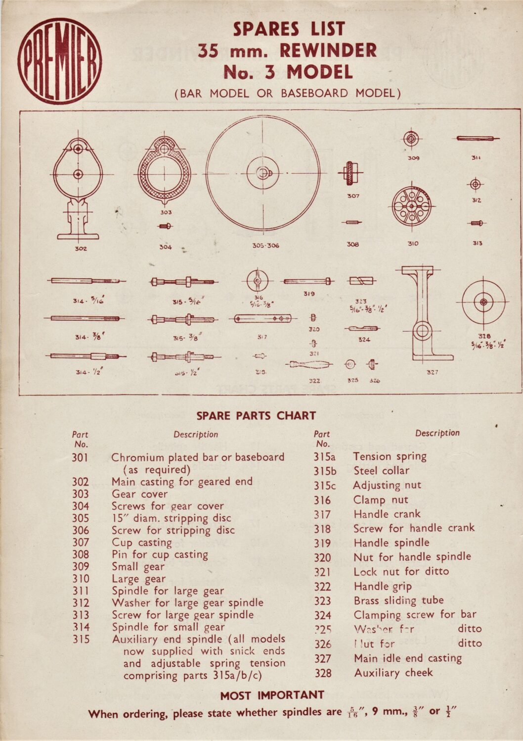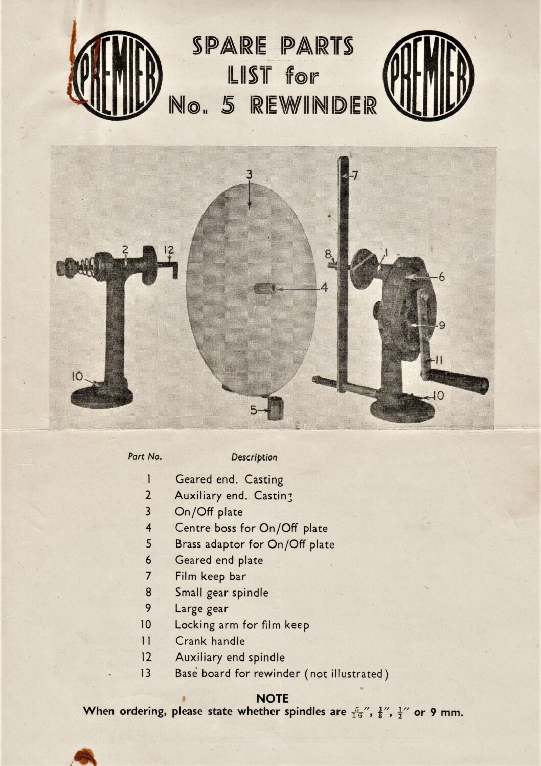 Spare parts list for the Premier No. 3 film rewinder