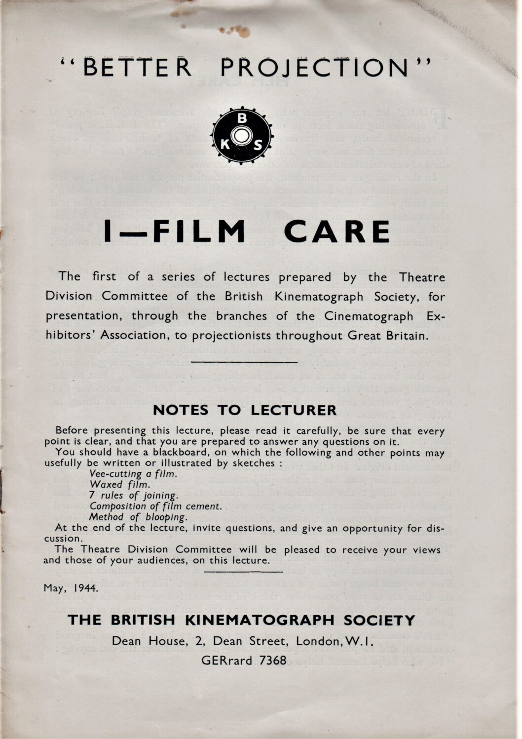 The first lecture on better projection from the BKS, on film care.