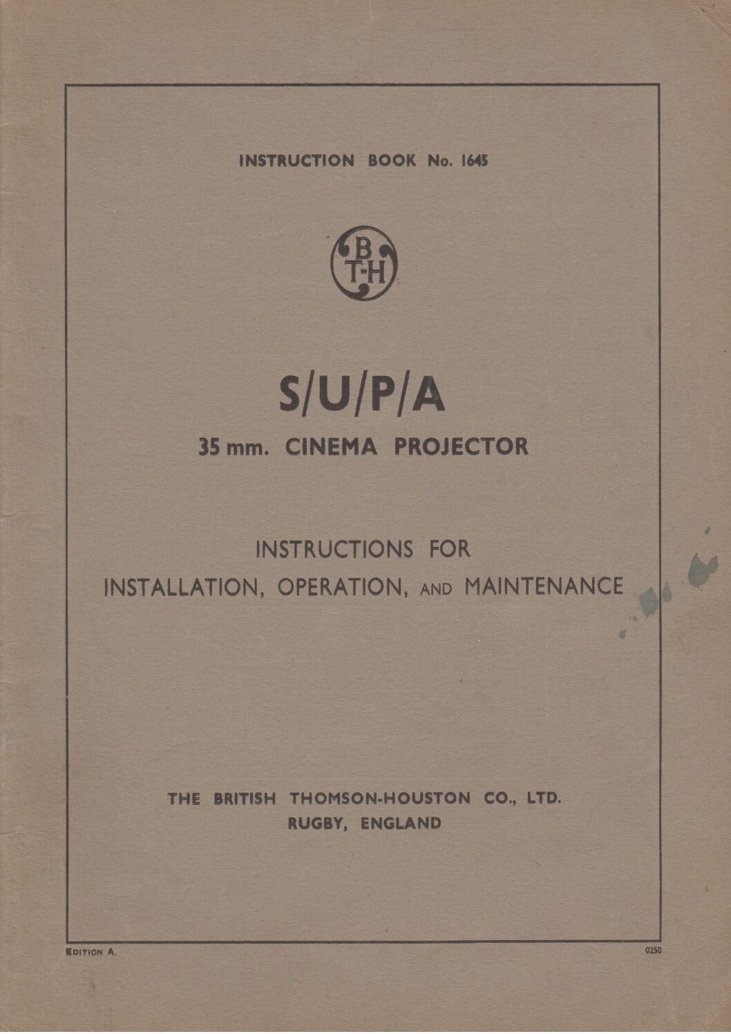 • Supa – Mk. 2 Cinema Projector – Instructions For Installation, Operation, And Maintenance