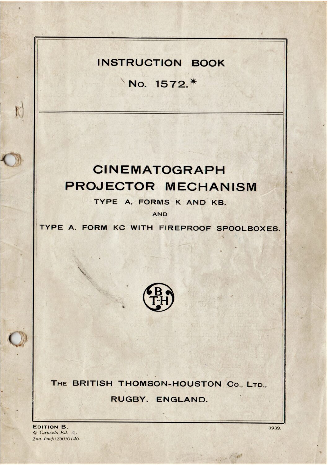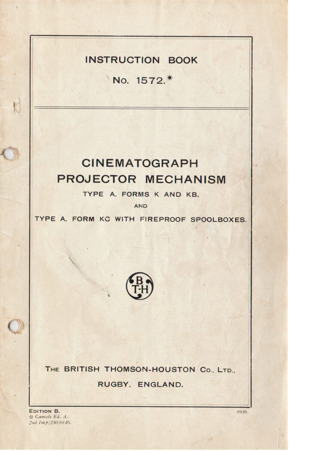 Instruction book No. 1572 from BT-H, on the Type A Forms K, KB and KC projector mechanism.