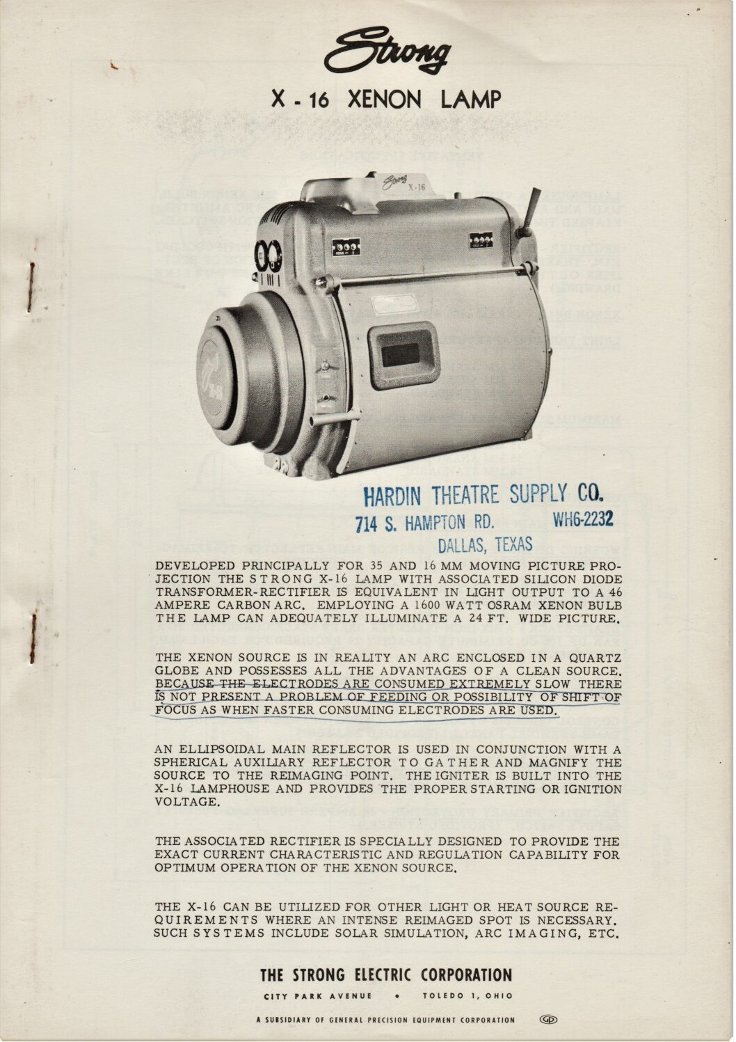 A brochure for the Strong X-16 xenon lamphouse for 16mm and 35mm projectors.
