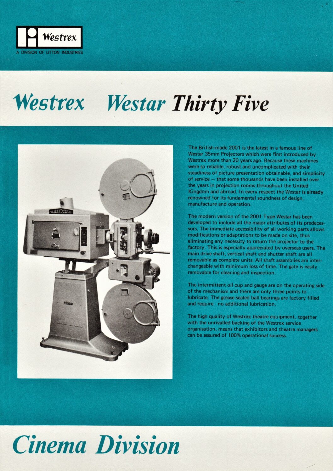 A brochure covering the range of 35mm equipment by Westrex, including the 2001 projector, 2003 soundhead, and amplifiers.