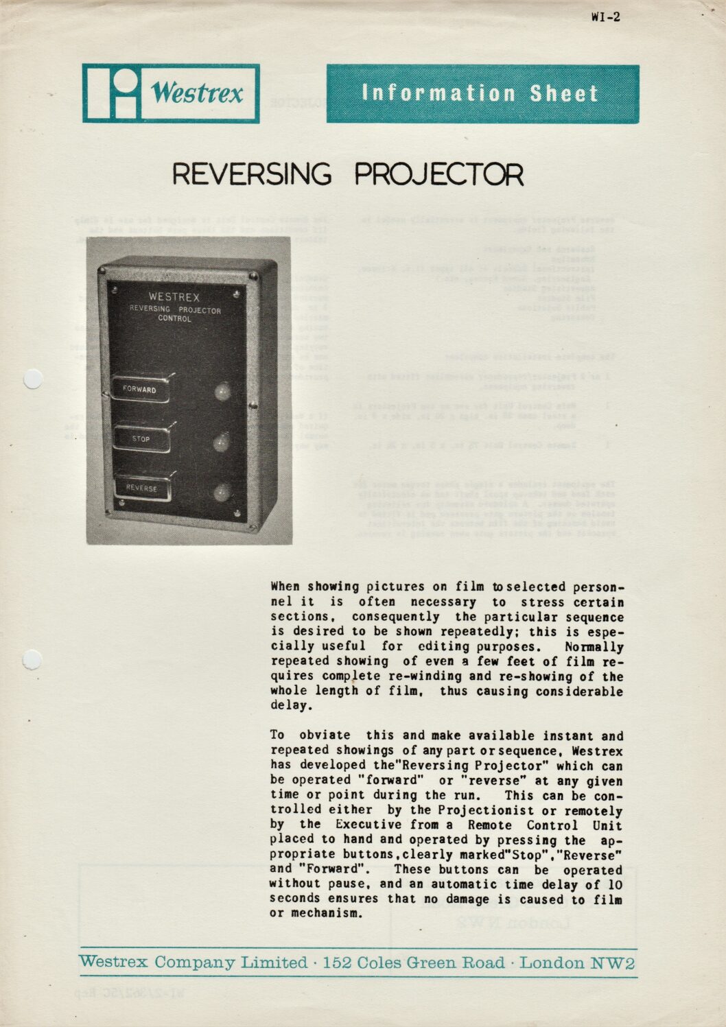 The information sheet about the Westrex reversing projector, useful for studio and education use.