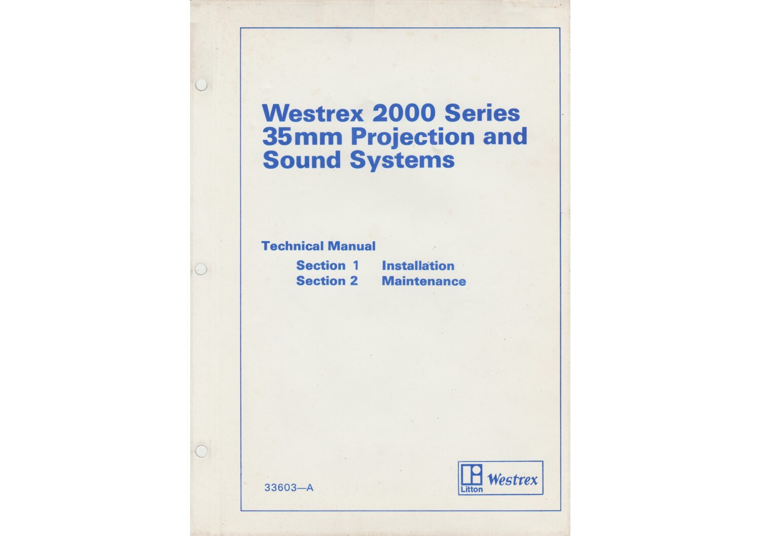 Technical manual covering the installation and maintenance of the Westrex 2000 projector.