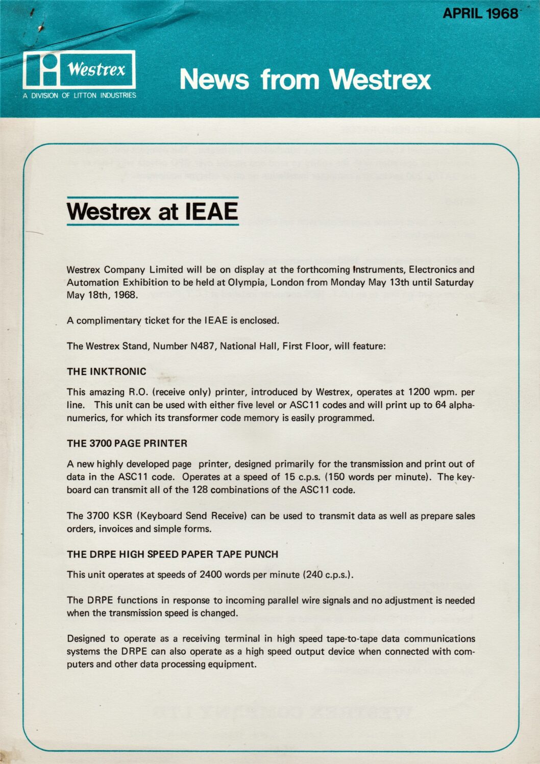 A press release from Westrex advertising the upcoming Instruments, Electronics and Automation Exhibition in 1968.