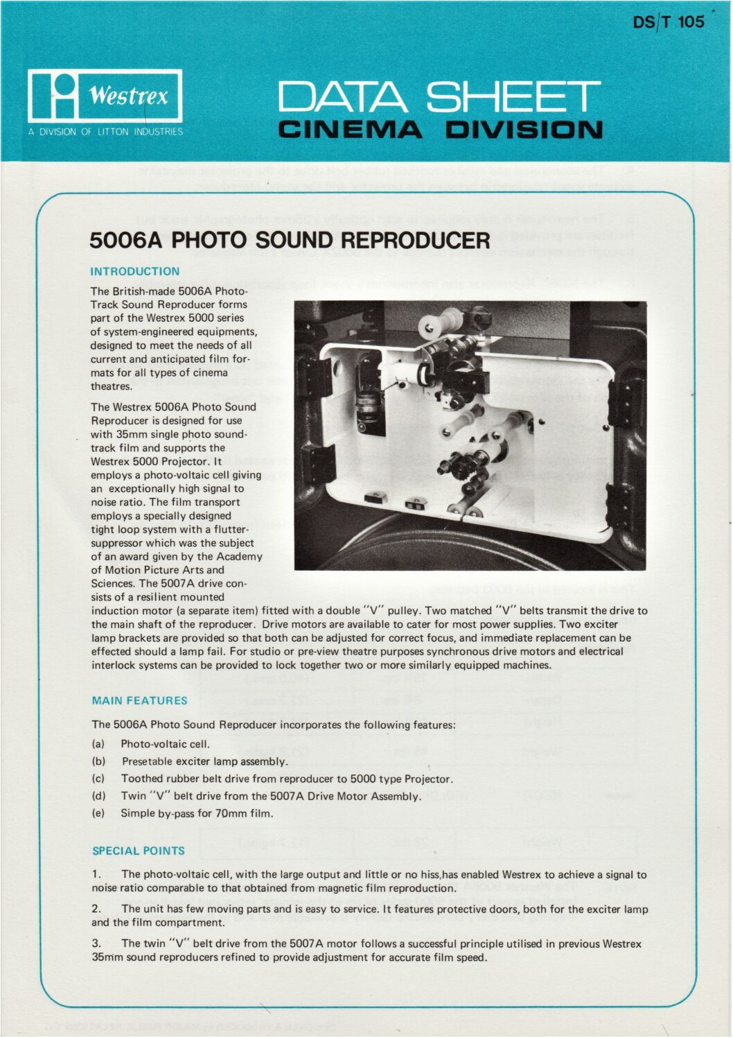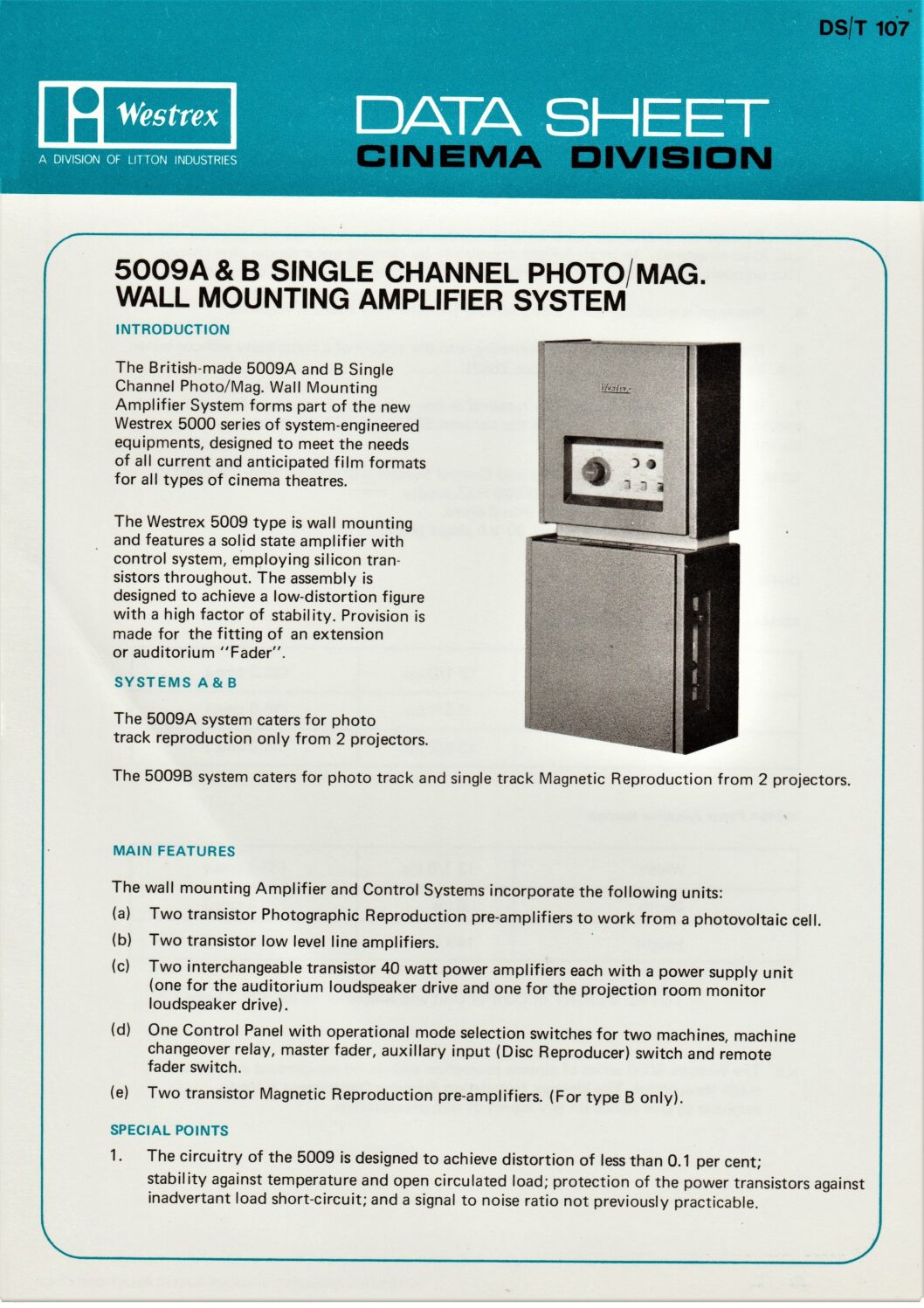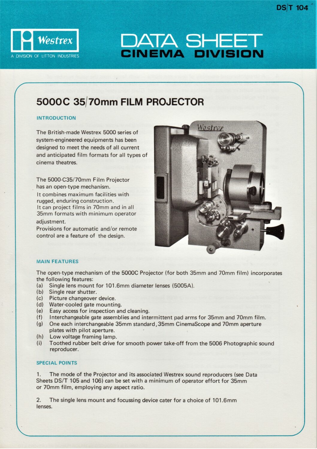 Data sheet about the Westrex 5000A dual gauge 35/70mm film projector.