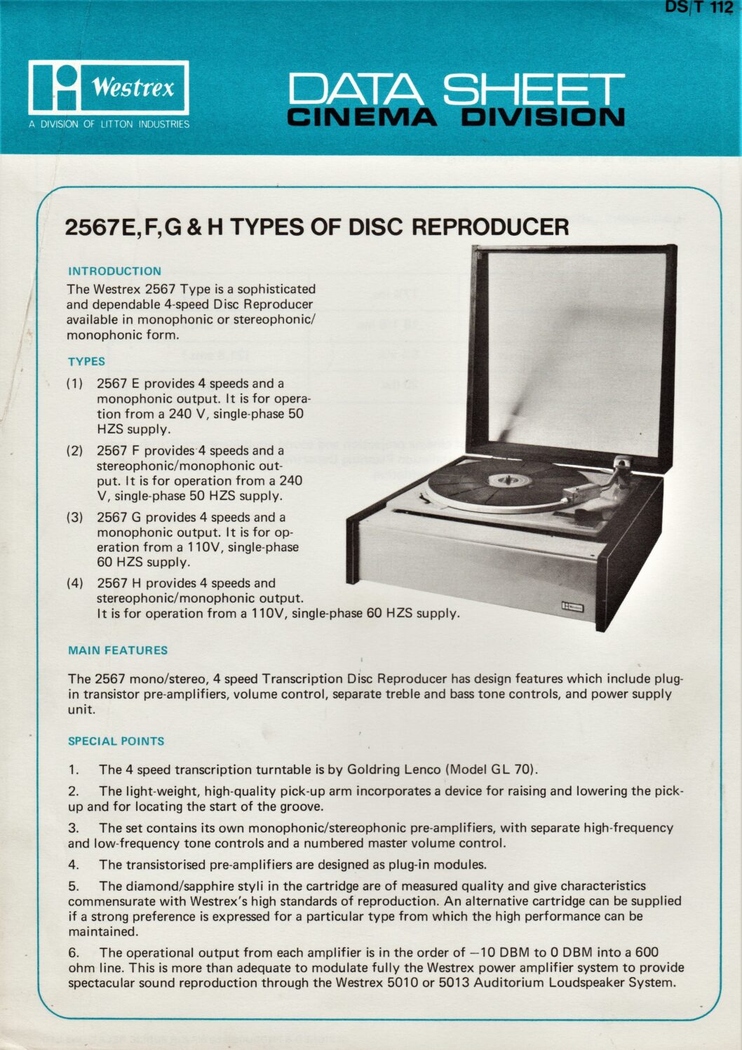 Datasheet for the Westrex 2567 record players.