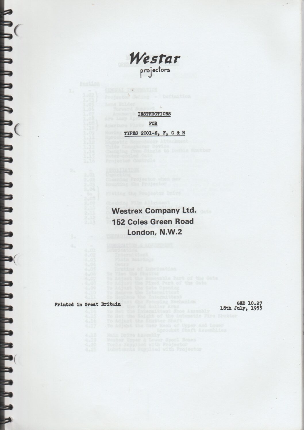 Operating instructions for the Westar 2001 E, F, G and H film projectors.
