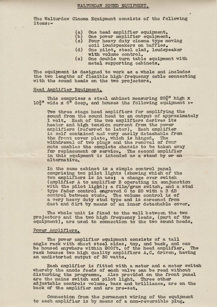 A brochure of the cinema sound equipment from Walturdaw.