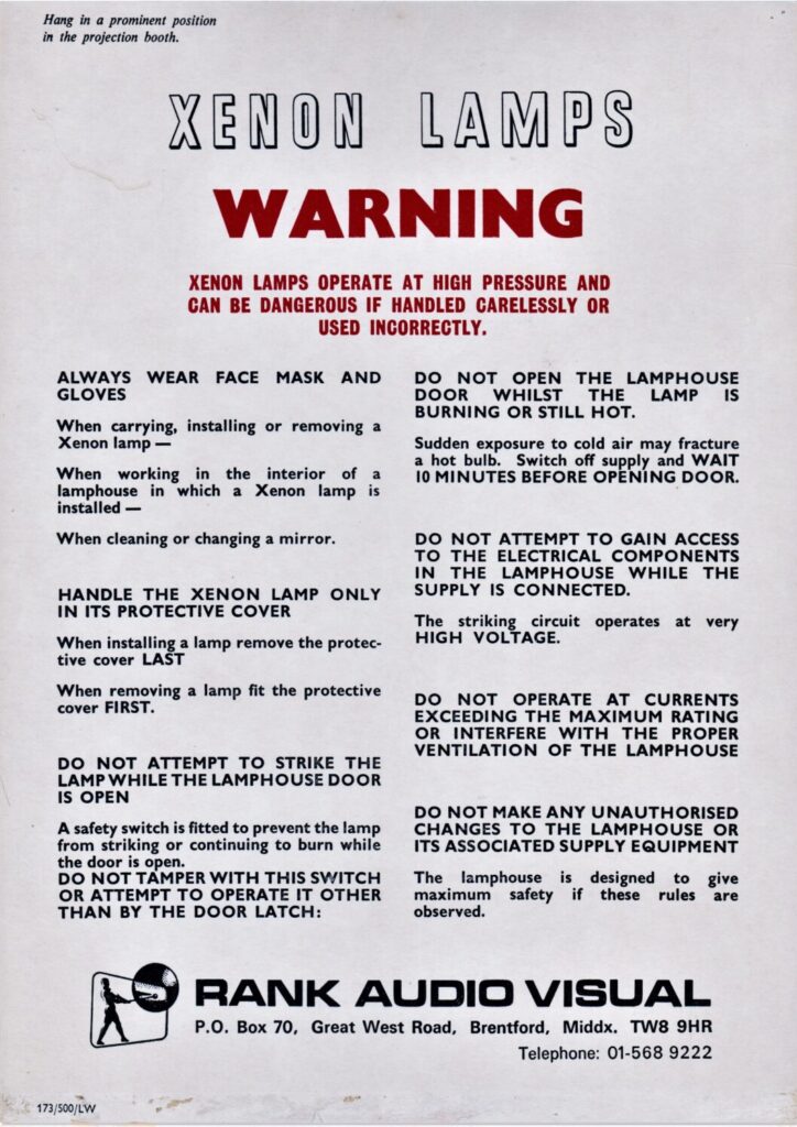 A poster to hang in the projection booth from Rank about the dangers of Xenon lamps.