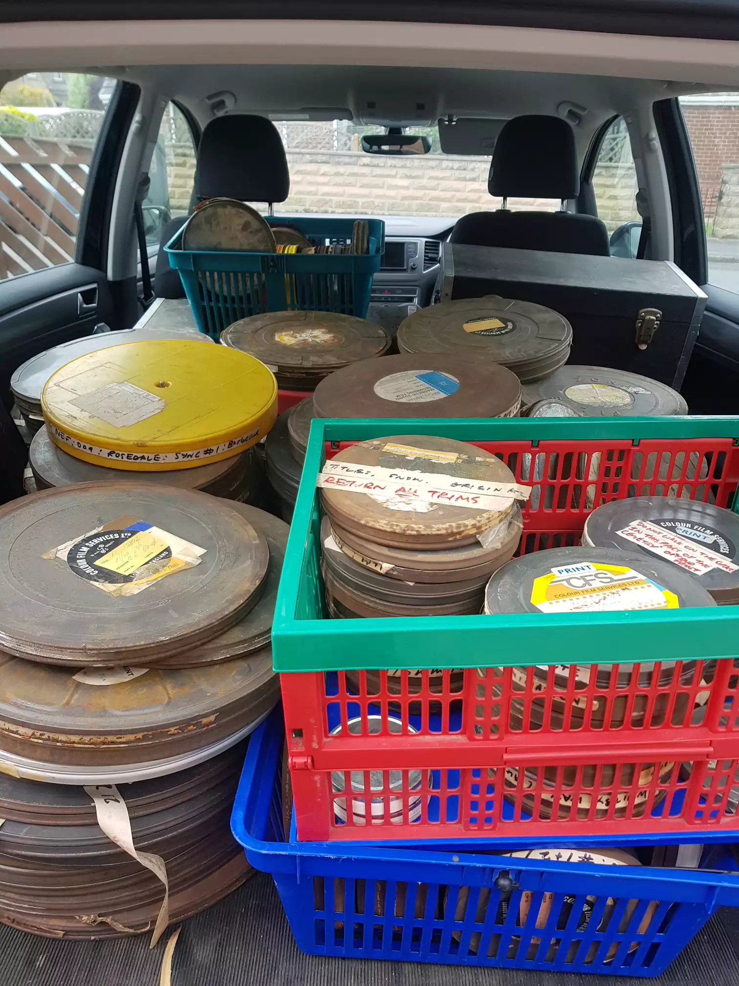 Richard Hawley, Tom Harris, and Peter Berry begin the task of sorting through new donations of 16mm films to the PPT.